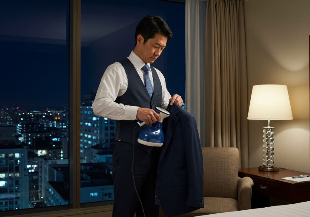 - 携帯用衣類スチーマー:どんなシワも一瞬で伸ばせる魔法のアイテム。アイロンのようにプレスしないため、生地を傷めにくく、テカリも防げます。コンパクトなモデルなら場所も取りません。
