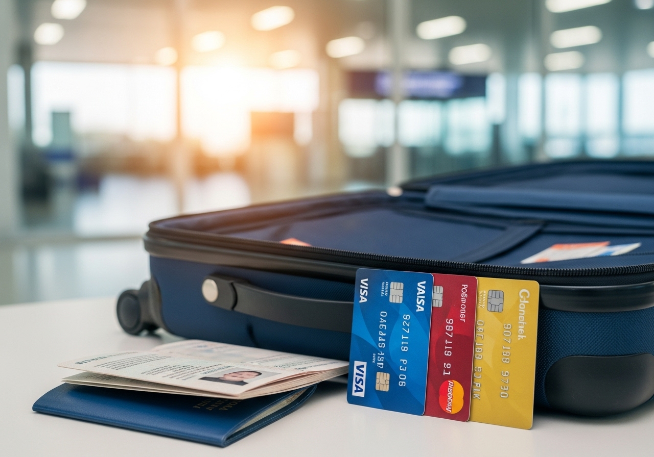 クレジットカード数枚と、旅行保険証券のイメージ。
