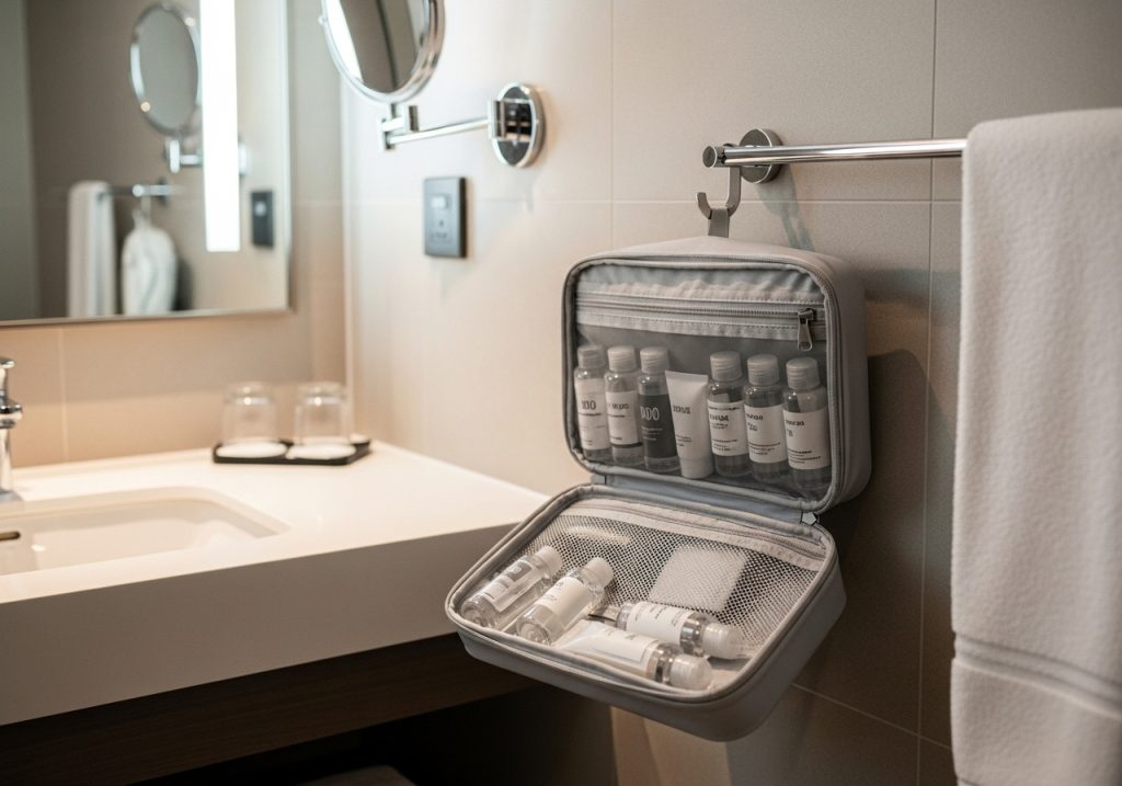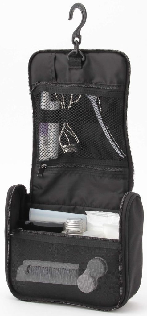 洗面用具や化粧品を機能的にひとまとめにでき、ケースを広げるとホテルのタオルフックなどに吊るして使えるため、物が散らかりがちな狭い洗面台を有効活用できます。
