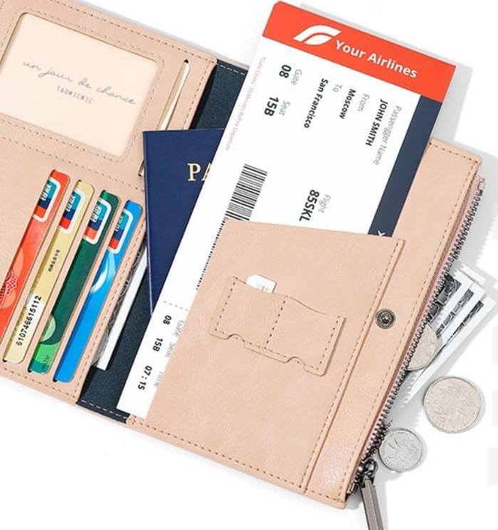例えば、左記商品はパスポートはもちろん、航空券、複数のカード、小銭や鍵を収納できるジッパーポケット、さらにペンホルダーまで備えた多機能タイプ。