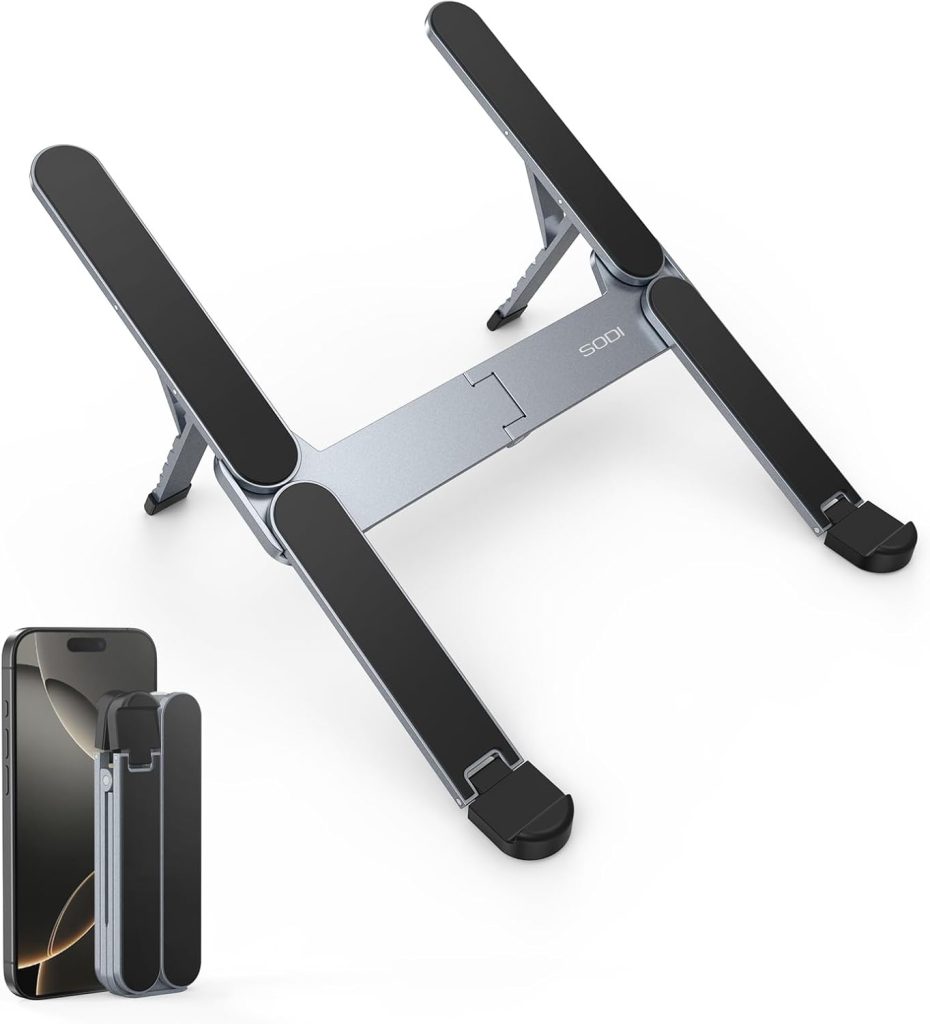 そんな時に役立つのが、角度を調整できる折りたたみ式のPCスタンドです。目線が上がることで自然と背筋が伸び、正しい姿勢を保ちやすくなるため、驚くほど体の負担が軽減されます。