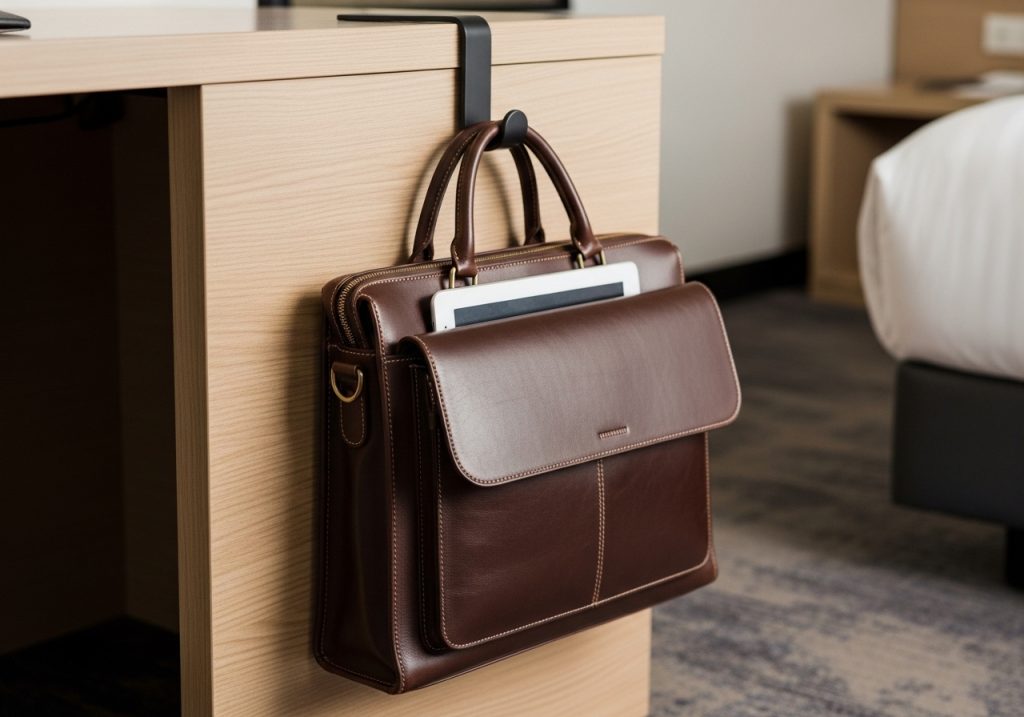 テーブルに引っ掛けるタイプの「バッグハンガー」もおすすめです。足元に置きたくない大切なビジネスバッグを、目の届く範囲にスマートに掛けておくことができます。