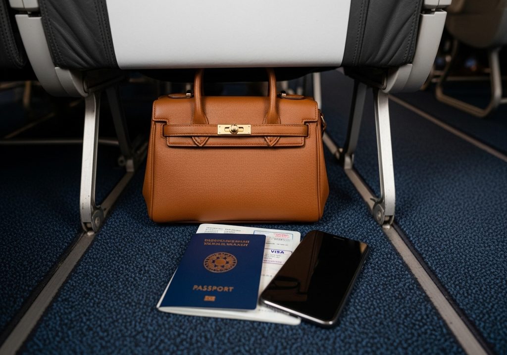 最も一般的なのが、前の座席の下に収納する方法です。これは、特にフライト中に頻繁に取り出したいもの(スマートフォン、読書物、飲み物など)を入れたハンドバッグに最適です。ただし、足元スペースが多少狭くなるため、長時間のフライトでは不便に感じるかもしれません。