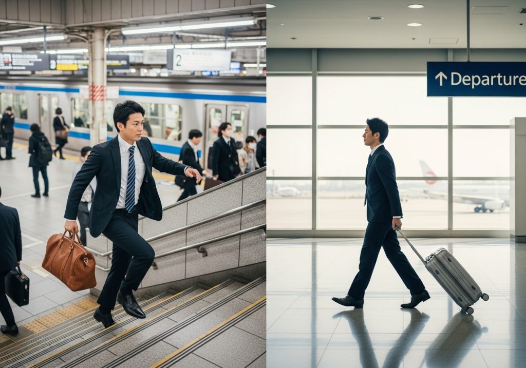 | 手持ち・肩掛けバッグ (トート/ボストン) | ・圧倒的な機動力で、階段や人混みでも動きやすい ・新幹線や電車の網棚などにスムーズに置ける ・訪問先で足元に置いても邪魔になりにくい ・ビジネスシーンに馴染むスマートな見た目 | ・荷物が重いと肩や腕への負担が大きい ・PCなど精密機器の保護性が相対的に低い ・容量に限界があり、お土産が増えると厳しい | 電車移動がメインで、フットワークの軽さを最優先する方。PCが軽量であるなど、荷物が比較的少ない方。 |