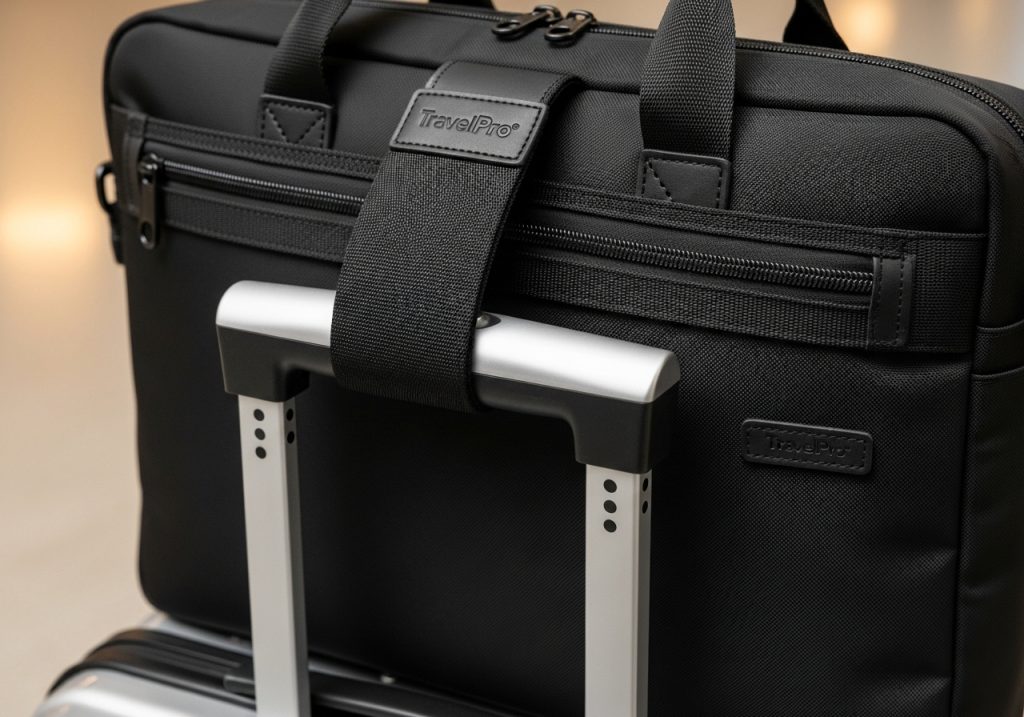 - キャリーオン機能(背面ループ): バッグの背面に、キャリーケースのハンドル(取っ手)に通せるループが付いている機能です。海外出張など、大きなスーツケースと併用する際に荷物を一つにまとめられて、移動が驚くほど楽になります。