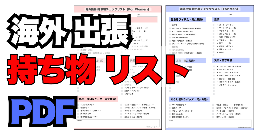 初めての海外出張、期待とともに「何か大事なものを忘れていないだろうか?」という不安がよぎるもの。 特に持ち物のパッキングは、出張の成否を左右しかねない重要な準備です。 そんな時に絶大な効果を発揮するのが、印刷して一つずつ着実に確認できるチ...
